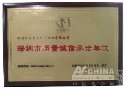 齊普光電榮膺“深圳市質(zhì)量誠信承諾單位”