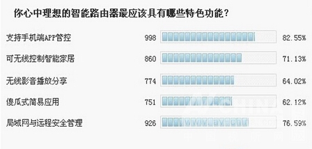 調(diào)查研究表明,有82.55%的網(wǎng)友希望智能路由可以實(shí)現(xiàn)手機(jī)端APP管控,76.59%的網(wǎng)友認(rèn)為應(yīng)實(shí)現(xiàn)局域網(wǎng)與遠(yuǎn)程的安全管理,71.13%的網(wǎng)友期望可通過無線來控制智能家居,還有64.02%的網(wǎng)友希望能夠?qū)崿F(xiàn)無線影音的播放分享,更有62.12%的網(wǎng)友期望智能路由擁有傻瓜式的簡易應(yīng)用。