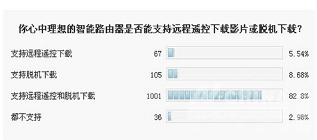 在隨后展開的調(diào)查中發(fā)現(xiàn),有高達(dá)82.8%的網(wǎng)友希望智能路由可以支持遠(yuǎn)程遙控下載影片或具有脫機(jī)下載的功能,明顯對于視頻的下載、傳輸需求還是很大的。