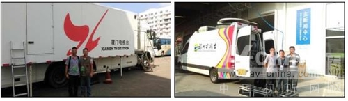 青運會五個賽區(qū)共使用了8輛轉(zhuǎn)播車,全部為索尼制作系統(tǒng),承擔了開閉幕式、福州和其他賽區(qū)重要賽事如田徑、游泳和體操等比賽的轉(zhuǎn)播活動。其中中央電視臺A車承擔了開幕式和田徑比賽的現(xiàn)場制播,福建臺轉(zhuǎn)播車承擔了男子排球和籃球的現(xiàn)場制播。