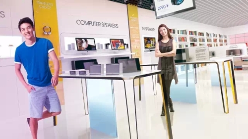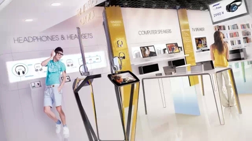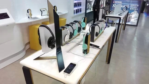 店鋪的布局也遵循了同樣的創(chuàng)意。我們把產(chǎn)品體驗放在中心區(qū)域,四周的墻面作為陳列!奥眯屑业倪x擇”用來重點突出適合旅行的產(chǎn)品。黑色與金色融合的金屬絲帶挑戰(zhàn)了任何現(xiàn)存的聲音產(chǎn)品展示方式。意在用輕盈的展示表達未來感。