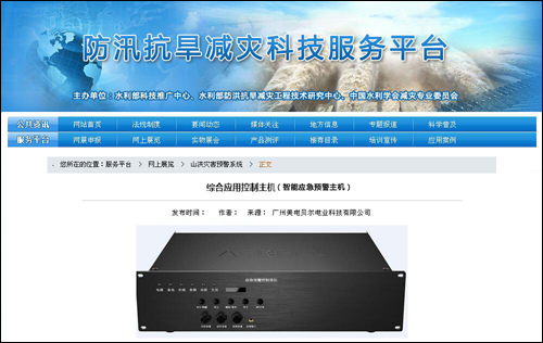 美電貝爾自主研發(fā)生產(chǎn)的智能應(yīng)急預(yù)警主機(jī)、智能應(yīng)急預(yù)警分機(jī)經(jīng)過(guò)嚴(yán)格的篩選和評(píng)審,最終已優(yōu)異的成績(jī)獲得了評(píng)審組的高度認(rèn)可,近期已經(jīng)在“防汛抗旱減災(zāi)科技服務(wù)平臺(tái)”進(jìn)行展覽。