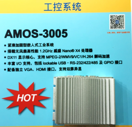 AMOS-3005是一臺(tái)無(wú)風(fēng)扇高性能1.2GHz四核處理器的x86嵌入式系統(tǒng),因其高性能低功耗,且連接、擴(kuò)展性極強(qiáng),成為本次威盛展位最受歡迎的工控系統(tǒng)。