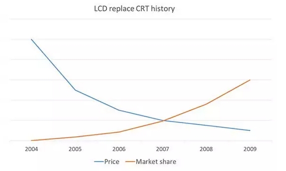 由技術(shù)更新?lián)Q代所引發(fā)的替代革命往往超出人們的想像.回顧電視機(jī)市場(chǎng)的發(fā)展歷程,在短短的5年內(nèi),液晶電視在全球范圍內(nèi)全面替代了CRT電視。