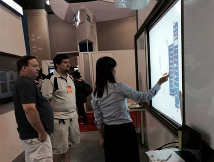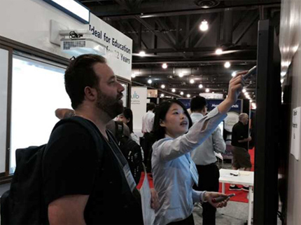 現(xiàn)場(chǎng)工作人員進(jìn)行“投影機(jī)+白板”解決方案應(yīng)用演示