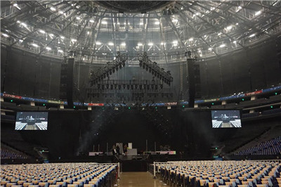 4月21日和22日的兩場演出使用Meyer Sound大型擴聲線性陣列LEO系統(tǒng),由每邊14只LEO-M、2只LYON-W和2只LYON-M共36只揚聲器組成主擴聲系統(tǒng),每邊12只1100-LFC低頻控制單元作為主系統(tǒng)的低頻系統(tǒng)。側方補聲系統(tǒng)由每邊11只LYON-M和1只LYON-W揚聲器組成。8只MINA揚聲器負責前排補聲,地面低音組由16只1100-LFC組成,14只MJF-212A用于舞臺監(jiān)聽。整套系統(tǒng)由1臺Galileo 616 AES和4臺Galileo Callisto 616揚聲器管理系統(tǒng)驅(qū)動和優(yōu)化。