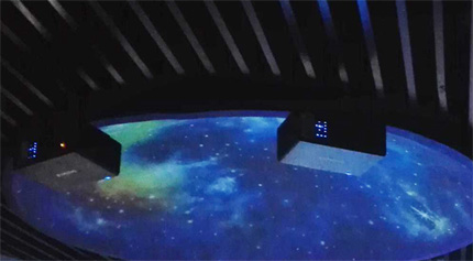 它打破了以往投影圖像只能是平面規(guī)則圖形的局限,利用特殊的光學(xué)鏡頭,將普通的平面影像進(jìn)行特殊的變換,投射到一個(gè)球形的屏幕內(nèi),形成一個(gè)內(nèi)投的球體影像。內(nèi)投球采用高流明的投影機(jī),高分辨率技術(shù)可以播放各種經(jīng)過視頻變幻的影像,使整個(gè)球體看起來就像一個(gè)科幻的大球,可以很好的吸引參觀者的眼球,該產(chǎn)品主要應(yīng)用于科普教育、展覽展示、廣告娛樂和虛擬仿真等領(lǐng)域。本球幕通過3臺(tái)視美樂SML-PF500工程投影機(jī)采用多機(jī)疊加,實(shí)現(xiàn)亮度提高,圖像無損的顯示效果。將球幕亮度提高三倍,完美解決現(xiàn)場(chǎng)環(huán)境光過高的缺憾。