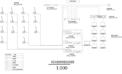 其中首層大貴賓接待室使用了三臺(tái)DAM-800級(jí)聯(lián)使用,使用了14支GS-450,分別輸入二臺(tái)數(shù)字智能混音器。同時(shí),另一臺(tái)設(shè)置為主控混音器輸入背景音樂(lè)及其他的音頻信號(hào)輸入。全數(shù)字智能混音器通過(guò)電腦設(shè)置好所需要的若干種聲音環(huán)境效果,儲(chǔ)存設(shè)置。在使用時(shí)再通過(guò)電腦直接調(diào)用所需要聲場(chǎng)效果即可。