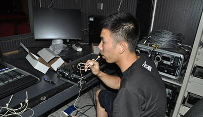 墨菲定律:任何一個事件,只要具有大于零的概率,就不能夠假設(shè)它不會發(fā)生——用于演出當中,永遠是一個圣典。本次力卡服務(wù)團隊三人,為演出做好死點測試、信號增補、設(shè)備調(diào)試及維護等事情后,在演出后臺充當了應(yīng)急備案的執(zhí)行人員。上下場后臺各一名人員拿一個后備話筒以備演員出現(xiàn)設(shè)備鼓掌后隨時更換,設(shè)備組一人全程監(jiān)控話筒電池電量及信號等顯示。因為本次話筒設(shè)備與調(diào)臺分開了設(shè)備機房,還配備了一名學院的學生幫忙隨時聯(lián)系。也正是因為如此嚴謹?shù)貙Υ,本次演出在三天的演出中都順利地完成,三組音樂劇中心的表演學生們都得到了如潮的贊譽。