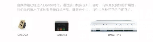 傳輸部分: 音頻傳輸已進入了Dante時代,通過接口機實現(xiàn)低延時,高保真及良好的擴展性,為滿足專業(yè)級、消費級等各種場景的應用需求,聲菲特推出了DACO 22, Dbox44-I, DACO 1616等多種接口機。