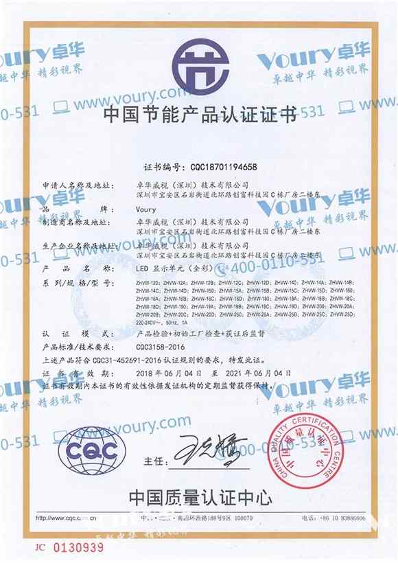 Voury卓華微間距、小間距LED顯示屏采用節(jié)能環(huán)保光源,光電轉(zhuǎn)換效率高、功耗低、抗輻射,使Voury卓華LED顯示屏產(chǎn)品獲得RoHS環(huán)保認(rèn)證、FCC認(rèn)證,通過一級能效檢測等。
