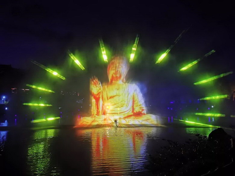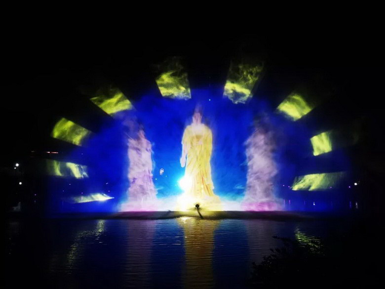 同樣,“根宮夜宴”的“水幕電影”場(chǎng)景也是由鴻合工程團(tuán)隊(duì),采用NEC PH3501QL+工程投影機(jī)打造,精彩紛呈的投影燈光秀,與環(huán)繞四周的“萬(wàn)佛歸宗”、上空的“空中佛影”等場(chǎng)景,形成一個(gè)整體,全方位、多維度的光影融合,帶來(lái)一場(chǎng)震撼人心的視聽(tīng)盛宴。