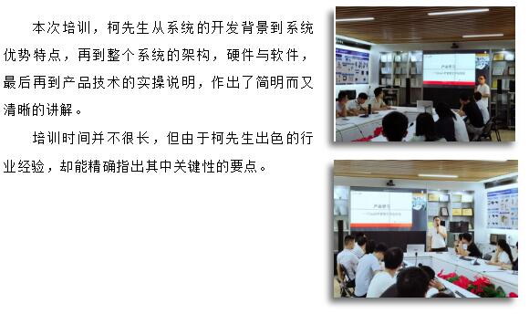 本次培訓(xùn),柯先生從系統(tǒng)的開發(fā)背景到系統(tǒng)優(yōu)勢(shì)特點(diǎn),再到整個(gè)系統(tǒng)的架構(gòu),硬件與軟件,最后再到產(chǎn)品技術(shù)的實(shí)操說明,作出了簡(jiǎn)明而又清晰的講解。