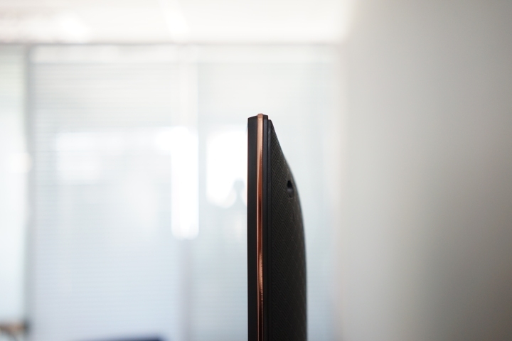 同樣使用玫瑰金色的還有創(chuàng)維A10的底座支架以及邊框金屬條,在整體黑灰色系的產品上形成了鮮明的撞色,也為A10增加了一種尊貴的感覺。