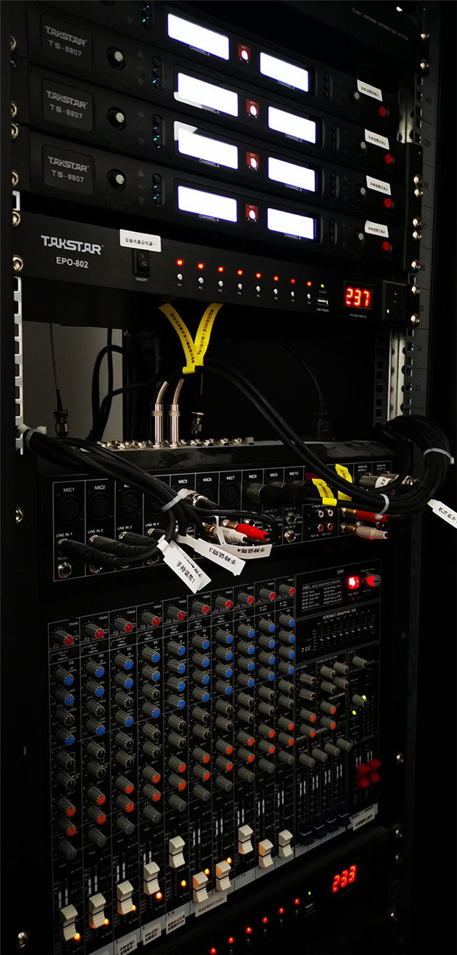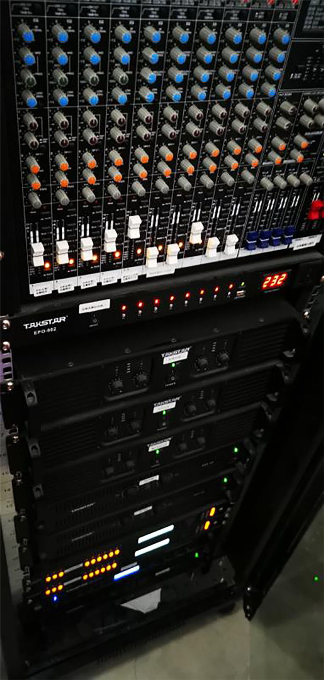 為確保調(diào)音臺(tái)在整套音響系統(tǒng)中的樞紐作用,選用可靠性良好的XR-1016FX 十六路調(diào)音臺(tái)實(shí)現(xiàn)多路輸入信號(hào)放大、混合、分配、音質(zhì)修飾和音響效果加工;周邊設(shè)備中的EKX-306 數(shù)字音頻處理器基于DSP運(yùn)算平臺(tái),是3進(jìn)6出的音頻處理器,具備增益、靜音、LINK、高切、低切等處理單元,一鍵式聯(lián)機(jī)使用戶的操作更方便快捷;EPO-802 電源時(shí)序器則實(shí)時(shí)監(jiān)控市電電壓的穩(wěn)定性,確保整套音響系統(tǒng)的可靠穩(wěn)定輸出。