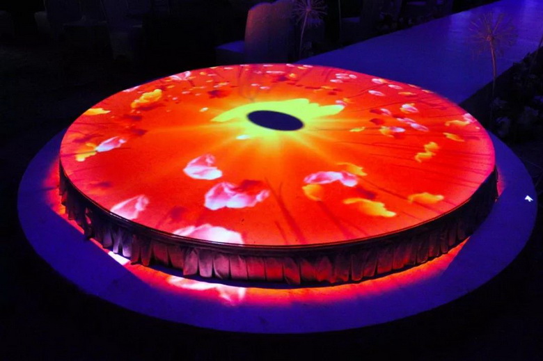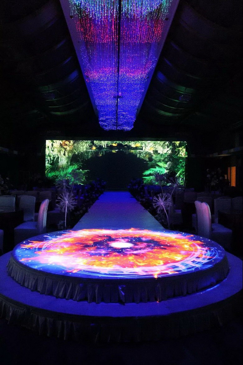 舞臺(tái)對(duì)面是一個(gè)直徑3米的公主臺(tái),該公主臺(tái)采用一臺(tái)NEC PA903X+(NP13ZL鏡頭)以垂直豎向投射方式打造。點(diǎn)亮投影機(jī),公主臺(tái)即刻變成一個(gè)多彩的大圓盤(pán),當(dāng)新娘穿著潔白的婚紗置身公主臺(tái),潔白的婚紗如施了魔法般即刻呈現(xiàn)出鮮花、火焰、星光等圖案,瞬間成為全場(chǎng)的焦點(diǎn)。