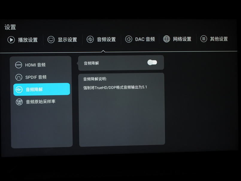 音頻設(shè)置上,如果你接的功放支持全景聲輸出那么建議選擇源碼輸出,如果是接回音壁這類只能解碼AC3或者DTS的設(shè)備則需要將降解功能打開(kāi)。