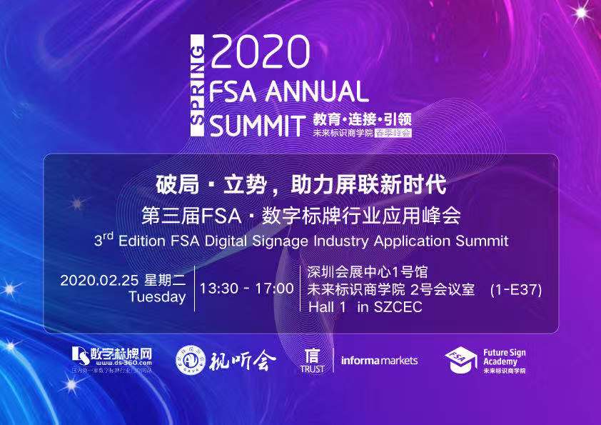 2020年2月25日下午,數(shù)字標(biāo)牌網(wǎng)與聞信合作的第三屆FSA數(shù)字標(biāo)牌行業(yè)峰會以“破局·立勢,助力屏聯(lián)新時(shí)代”為主題,探討數(shù)字標(biāo)牌、商用顯示的進(jìn)一步發(fā)展,將在深圳會展中心1號館的未來標(biāo)識商學(xué)院2號會議室召開。會議將邀請?zhí)堉秋@科技(深圳)有限公司總經(jīng)理郝光軍先生出席現(xiàn)場并作主題分享,太龍智顯作為專業(yè)的LED智慧終端提供商將與現(xiàn)場參會嘉賓一起展現(xiàn)新動態(tài),了解行業(yè)大勢,探討行業(yè)發(fā)展,探索未來智慧城市的發(fā)展趨勢。LED數(shù)字標(biāo)牌邁向智能化已經(jīng)是大勢所趨,隨著智慧城市建設(shè)的進(jìn)一步推進(jìn),未來用戶將會有更多、更新的需求出現(xiàn),我們誠摯邀請行業(yè)朋友共同參與、共同探討。