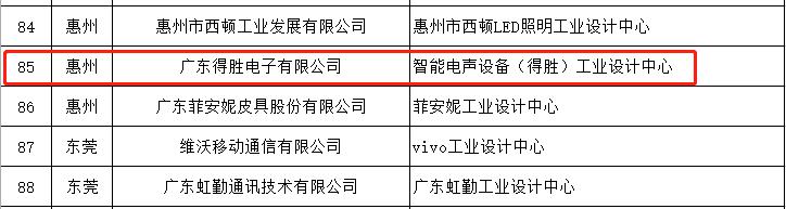 2019年廣東省第三批省級工業(yè)設(shè)計中心認定名單公布,廣東得勝電子有限公司等106家單位成功入選。廣東得勝電子有限公司智能電聲設(shè)備(得勝)工業(yè)設(shè)計中心被認定為“省級工業(yè)設(shè)計中心”。