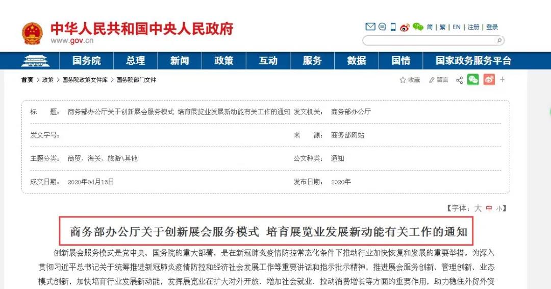 創(chuàng)新展會服務模式是黨中央、國務院的重大部署,是在新冠肺炎疫情防控常態(tài)化條件下推動行業(yè)加快恢復和發(fā)展的重要舉措。為推進展會服務創(chuàng)新、管理創(chuàng)新、業(yè)態(tài)模式創(chuàng)新,加快培育行業(yè)發(fā)展新動能,發(fā)揮展覽業(yè)在促進經(jīng)貿(mào)合作、增加社會就業(yè)、拉動消費增長等方面的重要作用,2020年4月13日,商務部發(fā)布了《關于創(chuàng)新展會服務模式 培育展覽業(yè)發(fā)展新動能有關工作的通知》(以下簡稱《通知》);