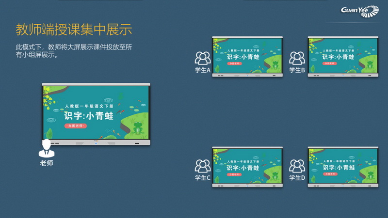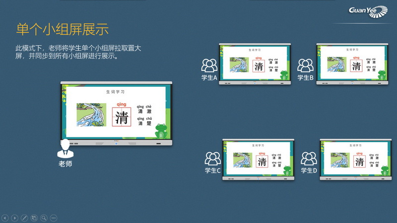 展示模式:老師主屏自帶控制功能,可輕松調(diào)取小組屏幕至主屏,其他小組屏默認自動同步顯示