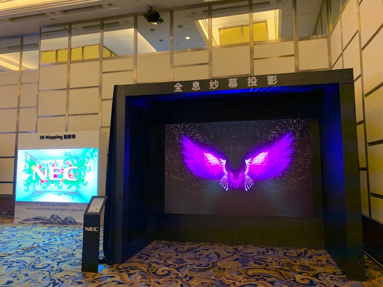授牌儀式過后,NEC投影機產(chǎn)品經(jīng)理張凱向大家翔實地介紹了移動式全景投影、全息紗幕投影、立體模型投影等新品解決方案,F(xiàn)場,醒目又炫酷的“NEC”LOGO格外吸睛,運用2萬流明英雄系列PX2000UL+ 雙色激光工程投影機,將品牌標(biāo)志做出繽紛絢麗的動態(tài)效果。