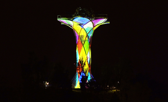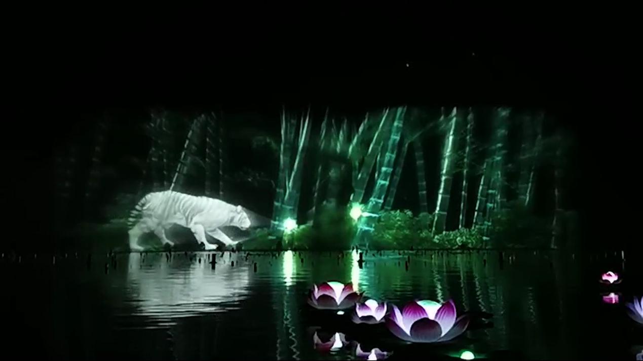“人間仙境,盛世蓮開”的景象恰與桃花島上的標(biāo)志性建筑盛世蓮花塔遙相呼應(yīng),相得益彰。夜晚的盛世蓮花塔被360°全景投影包圍,利用3D Mapping投影技術(shù),通過21臺NEC PX1004UL激光工程投影機,分三組將炫酷立體的影像畫面躍然于上。單機10000流明高亮度勾勒出清晰輪廓,倒映在湖面上花影婆娑。