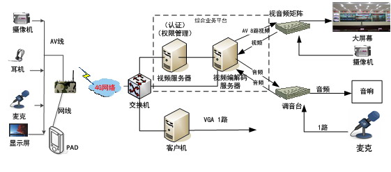 視音頻應(yīng)用系統(tǒng)主要包括視頻服務(wù)器、視音頻編解碼服務(wù)器、視音頻矩陣、調(diào)音臺(tái)、音箱、話(huà)筒、大屏幕顯示系統(tǒng)以及視頻會(huì)議系統(tǒng)軟件等。視音頻應(yīng)用系統(tǒng)工作流程如下圖所示: