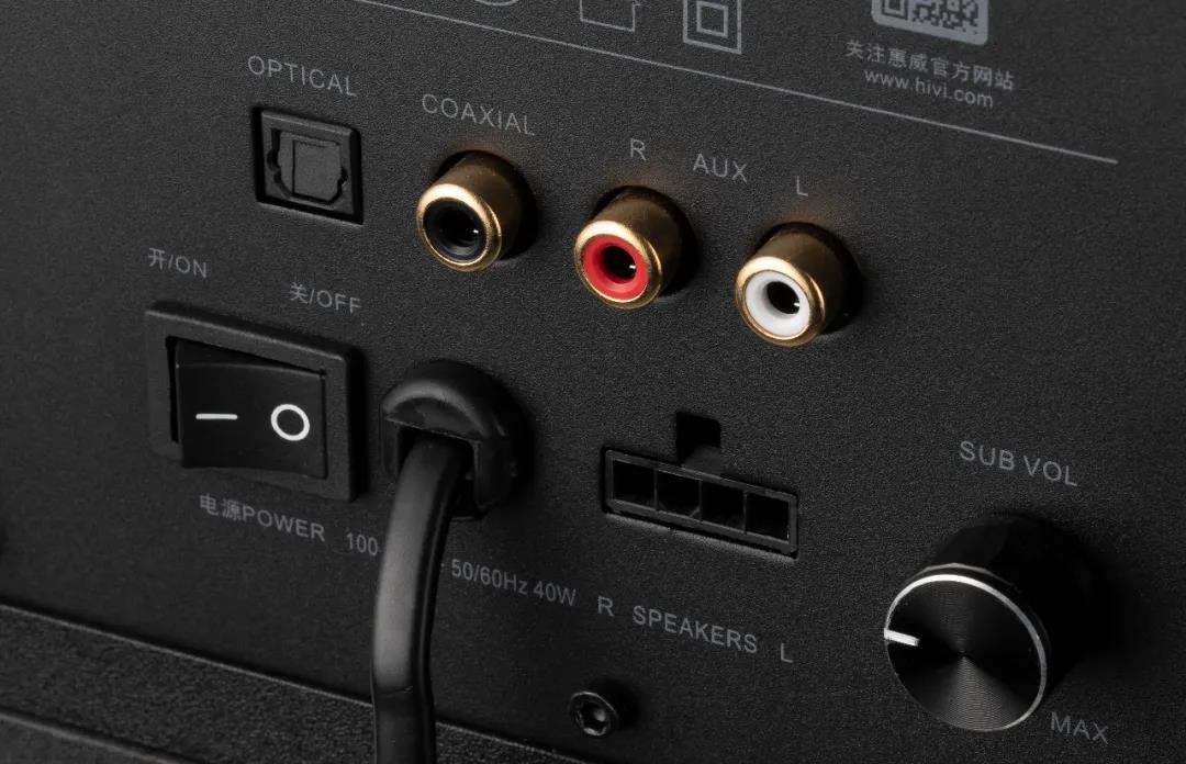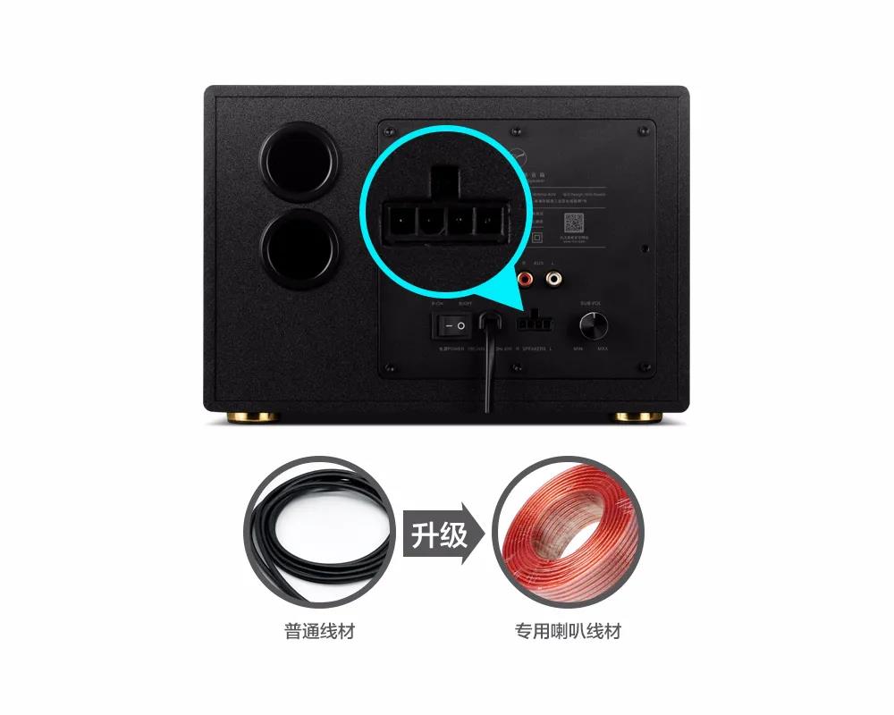 超低音的背面還配有低頻音量調(diào)節(jié),用戶可根據(jù)個人喜好調(diào)節(jié)低頻音量,打造個性化聽音。此外,衛(wèi)星箱連接線升級為專用喇叭線材,并采用一體式端口設(shè)計,連接更便捷,隨時聆聽好聲音。