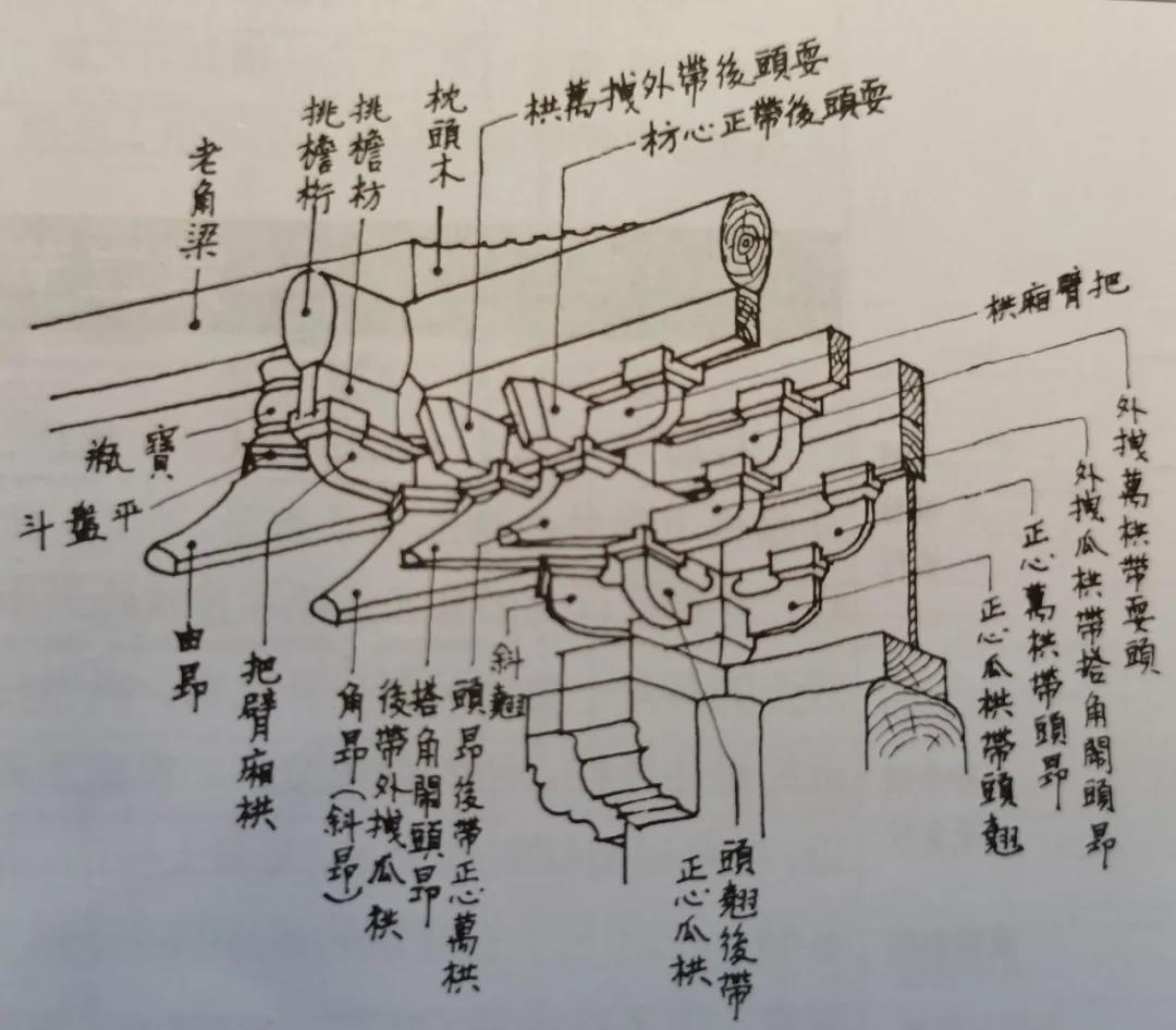 其中,屋頂?shù)奶厥廨喞侵袊ㄖ庑紊献铒@著的特征,屋檐支出深遠(yuǎn)則又為其特點之一,為求這檐部的支出,用多層曲木承托,便在構(gòu)架中產(chǎn)生了一個重要的斗拱部分。