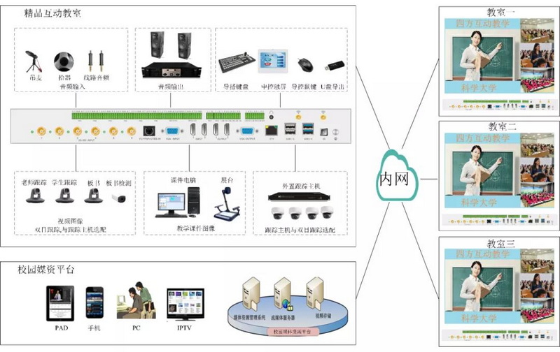 全自動錄播系統(tǒng)主要完成教師、學生的視頻自動跟蹤采集,音頻智能采集,教師電腦屏幕截取,教師/學生視頻/計算機畫面智能導播,以上信號源自動傳送至課件實時錄制系統(tǒng)生成優(yōu)質的精品課程,同時通過課堂直播系統(tǒng)在局域網、互聯(lián)網上直播為遠端用戶提供在線實時學習的平臺。