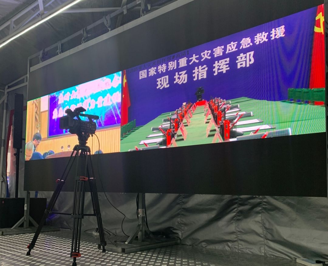 在應(yīng)急救援現(xiàn)場(chǎng)要實(shí)現(xiàn)信息暢聯(lián)、全面統(tǒng)籌,可視化指揮調(diào)度就顯得尤為重要。為了后方救援工作的高效快速開展,在演習(xí)現(xiàn)場(chǎng)的國(guó)家級(jí)指揮方艙指揮室內(nèi),采用了GQY視訊提供的快速拆裝架構(gòu)的LED屏。