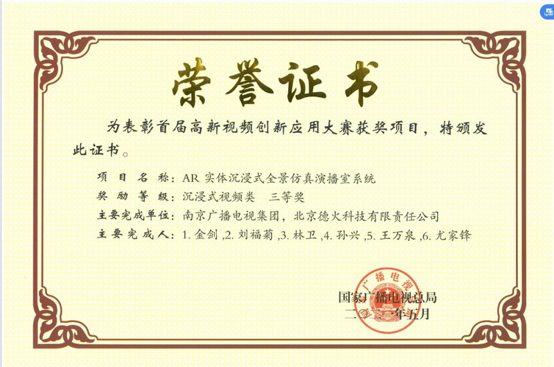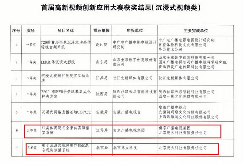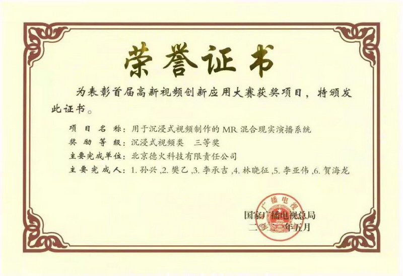 當(dāng)日主題報(bào)告會上,首屆高新視頻創(chuàng)新應(yīng)用大賽頒獎(jiǎng)儀式在北京國際會議中心隆重舉行。經(jīng)過專家組委會層層篩選,千家企業(yè)強(qiáng)強(qiáng)角逐,北京德火科技、南京廣播電臺&北京德火科技通過5G應(yīng)用、技術(shù)演示、效果呈現(xiàn)等多方面優(yōu)異表現(xiàn),經(jīng)過多番評審,最終憑借《沉浸式視頻制作的MR混合現(xiàn)實(shí)演播系統(tǒng)》、《AR實(shí)體沉浸式全景仿真演播室系統(tǒng)》獲得沉浸式視頻類三等獎(jiǎng)。