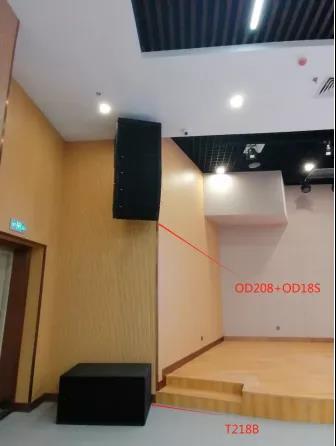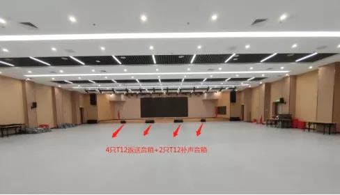 舞臺返送音箱采用了4只T12全頻音箱作為發(fā)言者/表演者的監(jiān)聽,為其提供悅耳的音質效果,并對主舞臺表演區(qū)域進行聲場覆蓋,以滿足不同場合的聲音需求。此外,因吊頂下總層高只有4.2米,且舞臺高度只有30cm,所以在舞臺前方與返聽音箱并排緊挨著落地安裝2只T12全頻音箱,來作為禮堂的補聲音箱,用于觀眾席前排補聲。