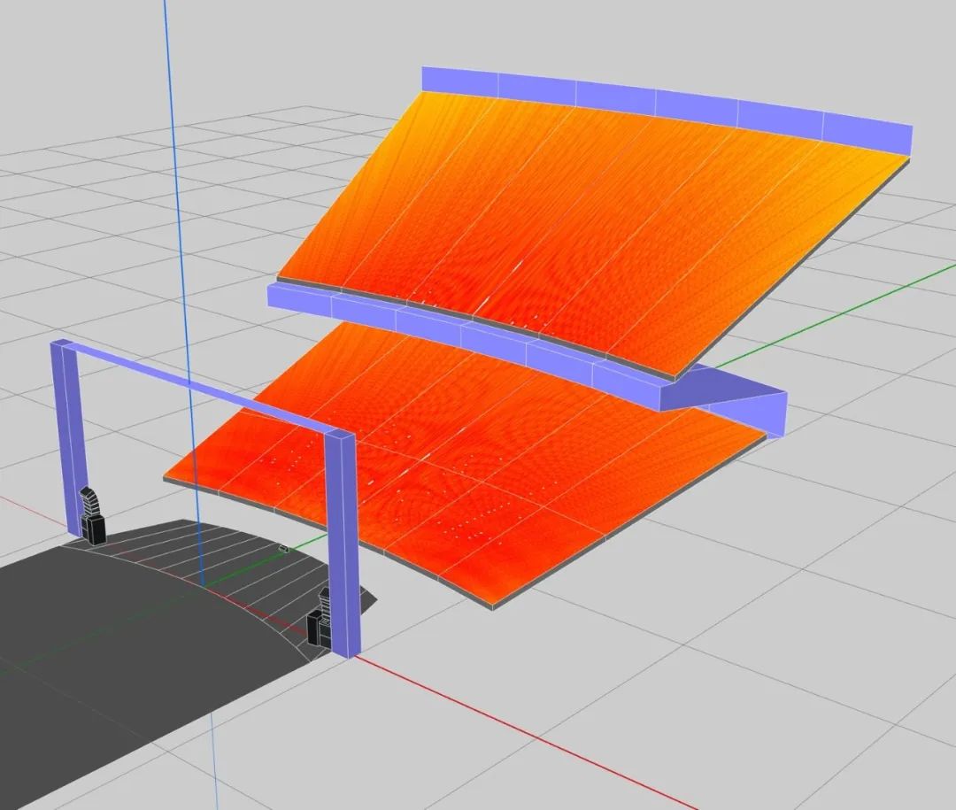 音頻系統(tǒng)從入場、安裝、調(diào)試、排練到正式演出的時間十分緊張,這時Soundvision 3D聲場模擬軟件就能發(fā)揮巨大的作用?梢栽诂F(xiàn)場進行快速建模,特別適用于流動演出活動。其3D模擬效果可以全面預(yù)測整個場地的聲場效果,包括每個犄角旮旯。同時可以準(zhǔn)確模擬揚聲器的偏軸響應(yīng)情況,通過偏軸響應(yīng)情況確定每組音箱之間的角度及距離。除此之外,Soundvision還可以查看每組揚聲器的受力情況,確保吊掛揚聲器及落地?fù)P聲器有非常高的機械安全性能。