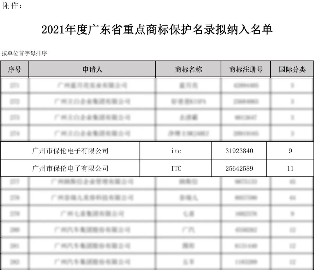 2022年4月25日,2021年度廣東省重點商標(biāo)保護名錄正式公告。本次活動共有1287件申報材料進入專家評審環(huán)節(jié),經(jīng)過商保委審議會議后,有580件商標(biāo)進入公示環(huán)節(jié),公示過后,最終共有607件商標(biāo)被納入2021年度廣東省重點商標(biāo)保護名錄。廣州市保倫電子有限公司“itc”、“ITC”商標(biāo)從眾多申請中脫穎而出,成功納入2021年度廣東省重點商標(biāo)保護名錄。