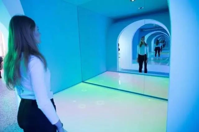 大圓鏡面將體驗者的彩色光影反射到墻面上。當(dāng)體驗者將自己置于光錐中時,便會在墻面上找到共鳴的引語。
