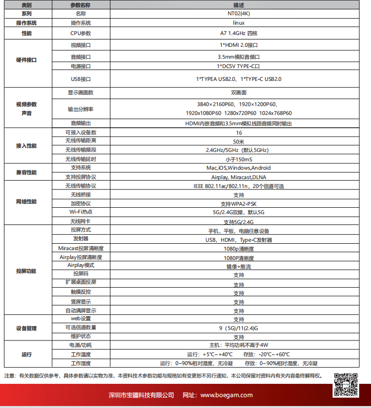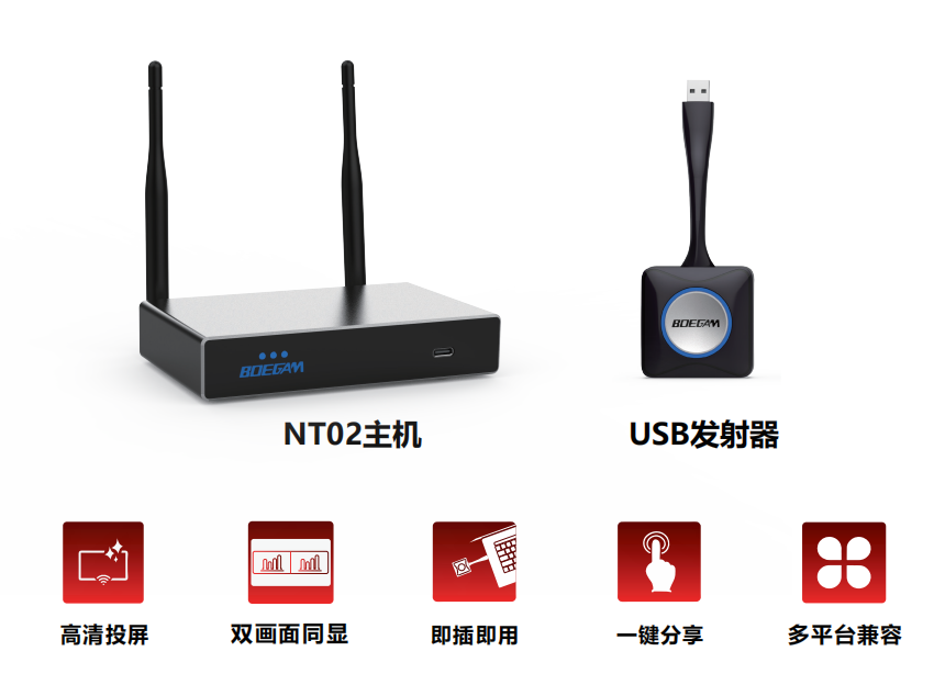 BOEGAM NT02 4K是一款基于linux系統嵌入式硬件架構的無線投屏系統,即可將手機,平板,電腦設備的內容無線分享至顯示終端。全面兼容MAC,iOS, Android,Windows等系統設備。產品設計簡潔,外觀小巧。安裝便捷,即插即用。