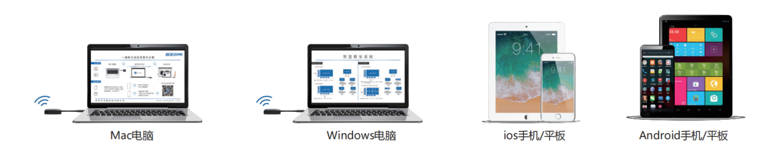 全面兼容,多用戶分享 全面兼容Windows、Mac OS、iOS、Android、鴻蒙 等主流操作系統設備。充分滿足主流辦公、會議、教學、家庭娛樂等場合的投屏需求。支持16個用戶同時接入。不同設備靈活切換,實現多方投屏,會議互動更高效。