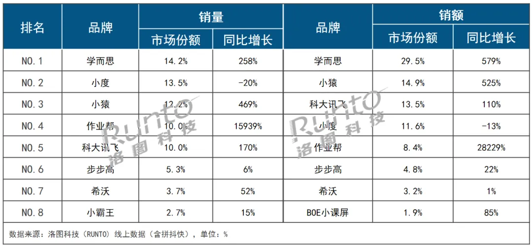 上半年的規(guī)模預(yù)測方面,洛圖科技(RUNTO)判斷,中國學(xué)習(xí)平板線上市場的全渠道銷量將為158萬臺(tái),同比增長55%。