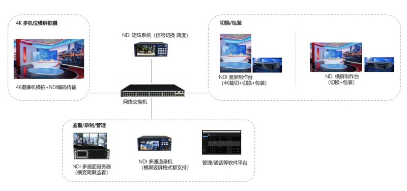 前端多機(jī)位攝像機(jī)正常橫屏拍攝,轉(zhuǎn)換為NDI IP信號進(jìn)入后端NDI切換臺。用于豎屏制作的NDI切換臺,可對橫屏信號進(jìn)行裁切后生成多路豎屏素材,經(jīng)過切換包裝后輸出豎屏PGM信號。而用于橫屏制作的NDI切換臺,則可直接利用橫屏信號源進(jìn)行制作包裝,輸出橫屏PGM信號。系統(tǒng)中NDI矩陣、NDI多畫面系統(tǒng)、NDI多通道錄機(jī)等,都支持豎屏/橫屏信號的處理。該方案要求前端拍攝采用4K拍攝,這樣通過后端裁切后才可保證是1080P高清PGM信號。顯然這個(gè)裁切方案的優(yōu)勢是可支持橫豎同屏制作,滿足演播室大屏/小屏一起播出的業(yè)務(wù)需求,但是對現(xiàn)場負(fù)責(zé)拍攝和豎屏裁切構(gòu)圖的老師提出更高的要求。